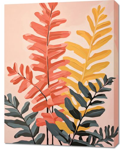 Obraz z serii wnętrza zatytułowany Paleta Natury. Zmysłowa gra kolorów liści, od delikatnych odcieni różu, przez intensywną czerwień, aż po złociste żółcie, kreuje uczucie ciepłego lata przenikającego do wnętrza domu. Delikatność i jednocześnie wyrazistość kształtów liści dodają kompozycji głębi i elegancji. Pastelowe tło harmonizuje z barwami roślin, tworząc spójną i relaksującą całość. Ten obraz doskonale odnajdzie się w modnych salonach, w przestrzeniach wellness, czy też w kawiarniach o nastrojowym, botanicznym klimacie, gdzie natura spotyka się ze sztuką.