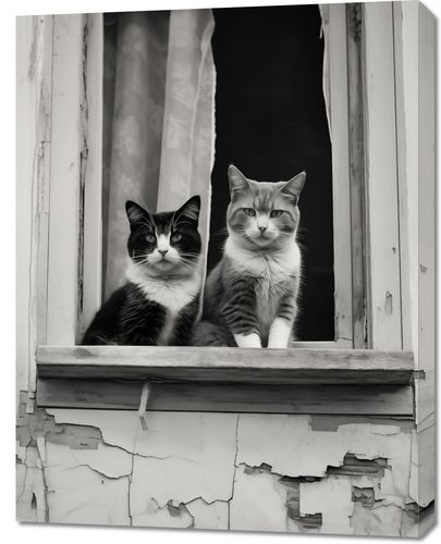 Obraz z serii wnętrza zatytułowany Para w Oknie. Uchwycenie momentu, w którym dwa koty o spokojnych i pełnych godności spojrzeniach pozują w oknie zaniedbanej fasady. Czarno-białe tło fotografii dodatkowo wzmacnia ich wyraziste, charakterystyczne wzory na sierści. Ten obraz to nie tylko urokliwa scena z życia miejskich kotów, ale również piękna metafora o spokoju i zgodzie, jaką można odnaleźć w najprostszych momentach codzienności. Obraz ten będzie wyjątkowym dodatkiem do każdego wnętrza, szczególnie polecany dla miłośników zwierząt i estetyki vintage, a także jako element ozdobny w kawiarniach czy księgarniach, który wnosi element ciepła i domowego klimatu.