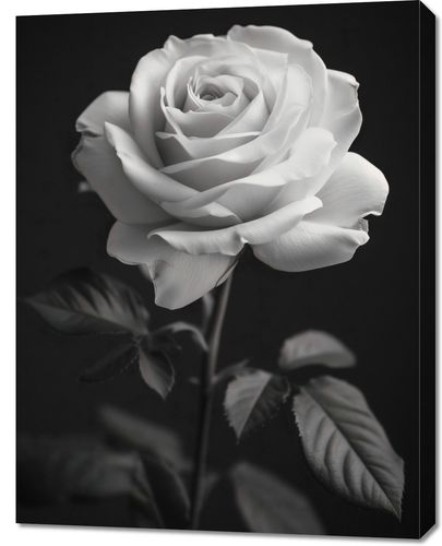 Obraz z serii wnętrza zatytułowany Płatki Róż. Obraz przedstawia ponadczasowy, monochromatyczny obraz róży. Róża, z delikatnymi i szczegółowymi płatkami, jest wyeksponowana na ciemnym tle, co wyostrza jej obrys i podkreśla subtelne niuanse jej formy. Gra światła i cienia nadaje głębi i trójwymiarowości, a ułożenie płatków w pełnym rozkwicie symbolizuje piękno i doskonałość. Liście i łodyga są skromne, ale wyraźne, dodając naturalności całej kompozycji. Obraz oddaje esencję delikatności i elegancji róży, co sprawia, że jest idealny dla każdego, kto szuka elementu dekoracyjnego o subtelnym pięknie i spokojnej, relaksującej estetyce.