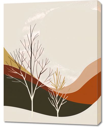 Obraz z serii minimalistyczne zatytułowany Pustynia Widzi. Obraz ukazuje dwie subtelne, ogołocone z liści drzewa, które wyłaniają się z miękkich, falujących form pustynnych wydm. Barwy są stonowane, z dominującymi odcieniami brązu, beżu i terakoty, co oddaje ciepłą i suchą atmosferę pustyni. Tło zawiera tekstury, które mogą przypominać piasek lub delikatną gęstwinę. Ten obraz doskonale sprawdzi się jako dodatek do wnętrz w stylu natur, dodając im ziemiściej palety i przywołując poczucie spokoju oraz prostoty. Będzie się dobrze komponować w przestrzeniach takich jak salon, pokój relaksu, a nawet biuro, wprowadzając elementy spokojnego krajobrazu, które mogą inspirować i uspokajać.