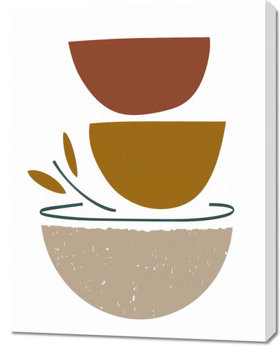 Obraz z serii boho zatytułowany Spójna Forma. Grafika przedstawia studium geometrycznej prostoty i spokoju. Półkoliste formy w odcieniach brązu, musztardowego i beżu, układają się w delikatnie zbalansowaną kompozycję, która może przywodzić na myśl przekroje naturalnych elementów lub subtelne, artystyczne interpretacje krajobrazu. Smukłe linie przypominające rośliny dodają lekkości i dynamiki, tworząc przyjemne dla oka połączenie form organicznych i geometrycznych.Dzieło świetnie wpisze się w ciepłe, jasne przestrzenie, takie jak przytulne kawiarnie, skandynawskie wnętrza lub jako element wykończeniowy w jadalniach, gdzie może dodać harmonii i naturalnego spokoju. Jest to doskonały wybór dla tych, którzy cenią sobie spokojną estetykę i chcą wnieść odrobinę zrównoważonej, wizualnej przyjemności do swojego otoczenia.