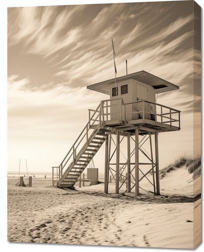 Obraz z serii pejzaże zatytułowany Strażnik Wydm. Prezentuje on sepiową scenę z wieżą ratownika na pustej plaży. Nostalgiczna tonacja obrazu podkreśla samotność struktury i piękno otaczającej ją dzikiej przyrody. Dramatyczne chmury na niebie i ślady na piasku prowadzą wzrok ku wieży, dodając głębi i historii miejscu. Ten obraz idealnie nadaje się do wnętrz, w których pragnie się wywołać uczucie spokoju, przestrzeni i czasów minionych, takich jak salony, pokoje wypoczynkowe, a także przestrzenie publiczne lub prywatne biura, które cenią sobie klasyczny wygląd i atmosferę.