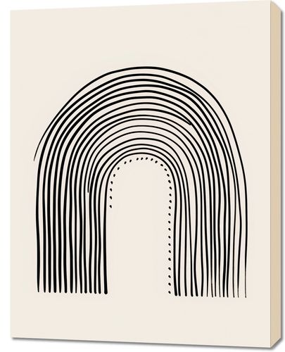 Obraz z serii boho zatytułowany Symetria Łuku. Grafika jest kwintesencją graficznej symetrii, przedstawiając hipnotyzujący motyw łuków, który wyłania się z rytmicznie powtarzających się, czarnych linii na beżowym tle. Kompozycja w formie bramy składa się z koncentrycznych półkoli, tworząc głęboką perspektywę, która przyciąga wzrok i prowadzi go ku centralnej, tajemniczej przestrzeni. Delikatne kropki podkreślają ścieżkę prowadzącą do wewnętrznego centrum, sugerując podróż ku własnej introspekcji. Ten minimalistyczny obraz będzie pasował do wnętrz o współczesnym charakterze, gdzie jego klarowna estetyka może stanowić przeciwwagę dla zgiełku codzienności, a także do przestrzeni w stylu zen, gdzie może wspomagać medytację i spokój umysłu.