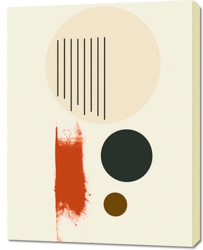 Plakat z serii boho zatytułowany Symetryczna Struna.Grafika przedstawia zrównoważoną kompozycję z surowymi elementami geometrycznymi i organicznym pociągnięciem pędzla. Kremowe tło rozświetla duże koło z rytmicznie rozmieszczonymi pionowymi liniami, które mogą symbolizować struny instrumentu lub elementy urbanistyczne. Intensywne maznięcie koloru w dolnej części obrazu dodaje energii i kontrastu, natomiast umieszczone obok czarne i brązowe kółka wprowadzają wrażenie głębi. Obraz idealnie uzupełni wnętrza w duchu minimalizmu i modernizmu, takie jak stylowe salony, gabinety, czy współczesne przestrzenie biurowe, gdzie może stanowić element kontrastujący z prostotą otoczenia.