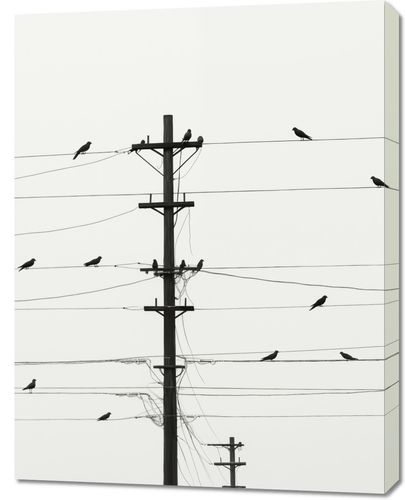 Obraz z serii pejzaże zatytułowany Symfonia na Drutach. Prezentuje on prostotę miejskiego krajobrazu, gdzie ptaki siedzą równomiernie rozmieszczone na przewodach telefonicznych. Czyste tło i sylwetki ptaków na linii energetycznej tworzą graficzny i rytmiczny wzór, który jest zarówno spokojny, jak i dynamiczny. Ten obraz to hołd dla nieoczekiwanej urody w codziennych scenach miejskich, idealny dla tych, którzy cenią sobie prostotę i nowoczesny design. Pasuje do nowoczesnych wnętrz biurowych, minimalistycznych salonów oraz wszędzie tam, gdzie sztuka ma za zadanie wprowadzać element spokoju i porządku.