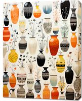 Obraz z serii wnętrza zatytułowany Symfonia Wazonów. Wspaniałe wazony w bogatej palecie kolorów, od głębokiej czerni do ciepłych odcieni pomarańczu, tworzą intrygującą mozaikę wzorów i kształtów. Delikatne motywy roślinne, które zdobią niektóre wazony, dodają uroku i lekkości, a różnorodność wzorów i faktur przyciąga wzrok i zaprasza do głębszej refleksji. Kontrast między jasnymi i ciemnymi barwami, a także subtelne niuanse w każdym wazonie, dodają tej kompozycji głębi i dramatu. Ten artystyczny plakat doskonale wpisuje się w klimat wyrafinowanych galerii sztuki, eleganckich kawiarni oraz nowoczesnych przestrzeni mieszkalnych, które stawiają na unikatowy design.