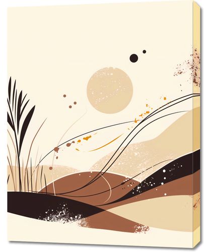 Obraz z serii minimalistycznej zatytułowany Szept Gwizdu. Widać na nim stylizowaną kompozycję z trawami i kształtami, które mogą przywoływać na myśl górskie krajobrazy. Barwy są ciepłe i naturalne, z dominującymi beżami, brązami oraz akcentami w kolorze terakoty.Ten plakat doskonale uzupełni wnętrza w stylu boho, skandynawskim, jak również te o bardziej rustykalnym czy naturalnym charakterze. Jego spokojna paleta kolorów i subtelna grafika sprawią, że będzie idealnym dodatkiem do sypialni lub salonu, wprowadzając atmosferę relaksu i spokoju.