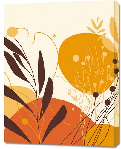 Obraz z serii minimalistyczne zatytułowany Szept Lasu. Spokojna i równoważąca kompozycja przedstawia zbiór roślin, wśród których przeważają delikatne i wydłużone liście. Kolorystyka grafiki oscyluje wokół ciepłych odcieni żółci, pomarańczy i brązu, co nadaje ilustracji przytulnego i spokojnego nastroju.Ta grafika będzie doskonale komponować się w przestrzeniach, gdzie chcemy stworzyć oazę spokoju, sprzyjającą relaksacji i odprężeniu. Może być wspaniałym dodatkiem do sypialni lub salonu, gdzie ciepłe barwy i natura mają pozytywny wpływ na samopoczucie.