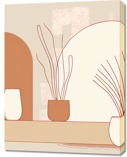 Obraz z serii boho zatytułowany Widok Roślin. Obraz przedstawia trzy stylizowane donice z roślinami, umieszczone na półce w harmonijnym ułożeniu, na tle geometrycznych kształtów w ciepłych, pastelowych kolorach. Proste linie i spokojne barwy tworzą atmosferę relaksu i spokoju, a subtelne tekstury dodają głębi i zainteresowania.Świetnie sprawdzi się w wnętrzach, które cenią sobie spokój i naturalne elementy, takich jak jasne salony, przytulne sypialnie lub miejsca wypoczynku. Jest to idealny wybór dla miłośników minimalizmu i skandynawskiej estetyki.