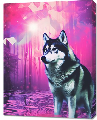 Obraz z serii pop art zatytułowany Wilczy Duch. Ta hipnotyzująca grafika łączy w sobie realistyczny wizerunek wilka z eterycznym, neonowym lasem w tle, co nadaje scenie onirycznego, mistycznego charakteru. Wilk, przedstawiony w pełnym majestacie, stoi na brzegu zaczarowanego jeziora, a tajemnicze, geometryczne kształty unoszą się w powietrzu, dodając kompozycji elementu fantastyki. Wyraziste kolory różu i fioletu tworzą niemal bajkową atmosferę. Obraz jest idealnym wyborem dla miłośników natury i jej mistycznych aspektów, świetnie nadaje się do wnętrz o tematyce przyrodniczej, pokojów dla młodzieży, lub jako unikatowy element dekoracyjny w przestrzeniach współczesnych.