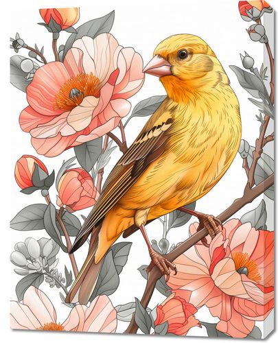 Obraz z serii natura zatytułowany Wiosenny Śpiewaczek przedstawia pełną detali i życia scenę, w której jaskrawo żółty ptak, przypominający kanarka, spoczywa na gałęzi wśród kwitnących kwiatów. Delikatne i subtelne kolory kwiatów w pastelowych odcieniach różu i pomarańczu tworzą miękki kontrast do żywego upierzenia ptaka. Precyzyjne linie i staranne cieniowanie nadają ilustracji realistycznego wyglądu, a roślinność w tle jest równie szczegółowo wykonana, co dodaje kompozycji głębi i bogactwa. Ten obraz to celebracja wiosennego odrodzenia i piękna natury, idealny do ożywienia każdego wnętrza, szczególnie pokoju dziennego, przestrzeni odpoczynkowej lub kawiarni o przytulnej atmosferze.