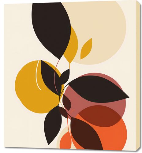 Obraz z serii minimalistyczne zatytułowany Brzask Złota.Ta grafika cechuje się prostotą form i bogactwem barw. Kontrastujące kształty liści na tle stonowanych kół tworzą harmonijną całość, która może być interpretowana jako metafora równowagi w przyrodzie. Ciepłe kolory żółci i pomarańczy przenikają się z głębokimi odcieniami brązu, co może sugerować zmianę sezonów lub cykl życia. Stylizacja ta przypomina o spokojnym, lecz żywym rytmie natury i mogłaby doskonale wpasować się w przestrzeń domową jako element dekoracyjny, niosący ze sobą spokój i refleksyjność.
