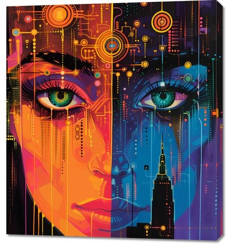 Obraz z serii abstrakcja zatytułowany Cyfrowa Psyche. Przedstawia fascynującą symetrię między ludzką urodą a technologicznym zawirowaniem. Wyraźne, zielone oczy kobiety są centralnym punktem obrazu, ożywione wizją elektronicznych obwodów i cyfrowych sygnałów, które przepływają przez i wokół jej wizerunku. Przecinające twarz linie symbolizują połączenie osobowości z nowoczesnymi technologiami, podczas gdy tło ukazuje zarys charakterystycznego krajobrazu miejskiego. Intensywne, neonowe kolory od pomarańczowego do niebieskiego nadają dziełu dynamiczny i nowoczesny charakter. Obraz ten będzie idealnym dodatkiem do współczesnych biur, salonów gier lub innych przestrzeni kreatywnych, które celebrują połączenie sztuki i technologii.