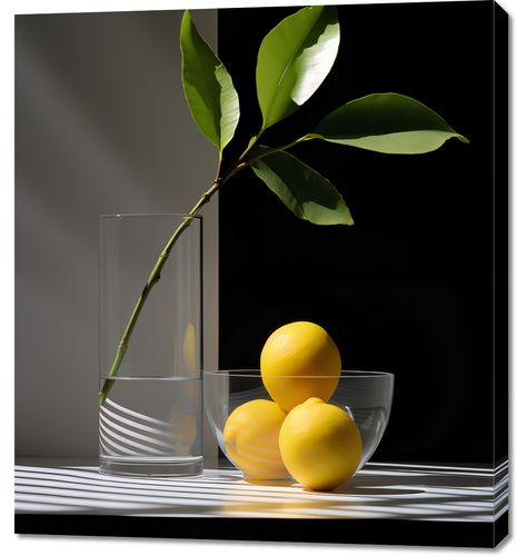 Obraz z serii wnętrza zatytułowany Cytrusowa Aranżacja . Ten obraz prezentuje minimalistyczną aranżację składającą się z jasnych, soczystych cytryn ułożonych w przezroczystej misce, akompaniowanych przez pojedynczą, zieloną gałązkę delikatnie wystającą z wysokiego szklanego naczynia. Kompozycja ta, umieszczona na kontrastującym tle, z subtelnymi cieniami i odbiciami światła, sprawia, że scena tętni życiem, mimo swojej prostoty. Idealny do nowoczesnych kuchni, jadalni lub jako odświeżający akcent w przestrzeniach biurowych, ten plakat wnosi element naturalności i czystości do każdego wnętrza.