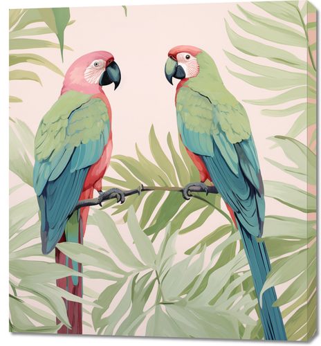 Obraz z serii wnętrza zatytułowany Dialog Ara. Na tej jasnej i pełnej życia ilustracji widzimy dwie papugi ary, które z gracją spoczywają na gałęzi, otoczone tropikalnymi liśćmi palm. Ich wyraziste, kolorowe upierzenie w odcieniach różu, zielonego i błękitu przyciąga wzrok i wprowadza egzotyczną atmosferę do każdej przestrzeni. Obraz ten jest idealnym wyborem dla miłośników natury i kolorowych, radosnych motywów, doskonale nadaje się do wnętrz, które pragną dodać odrobinę tropikalnego ciepła, takich jak jasne salony, dziecięce pokoje, a także jako dekoracja w kawiarniach i restauracjach o egzotycznym charakterze.