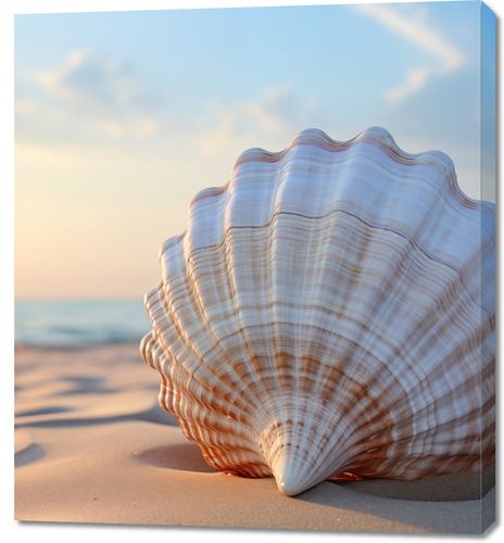 Obraz z serii natura zatytułowany Echo Morza. Delikatne, pastelowe barwy muszli występujące na pierwszym planie, z jej wyraźnymi liniami i subtelnym przejściem kolorów od kremowego do różowego, kontrastują z dynamicznym tłem zachodzącego słońca nad morzem. Złote refleksy światła na wodzie i miękki, piaskowy pierwszy plan tworzą poczucie głębi i spokoju. Idealny do wnętrz o tematyce morskiej, relaksacyjnych spa oraz jako element dekoracyjny w pokojach hotelowych z widokiem na morze.
