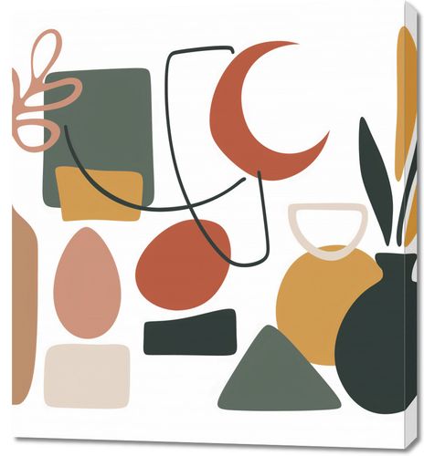 Obraz z serii minimalistyczne zatytułowany Formy Wyzwolone. Grafika składa się z zestawu prostej, ale wyrafinowanej kolekcji kształtów i form w przyjemnej, stonowanej palecie kolorów, z akcentami w odcieniach pomarańczu, zieleni, beżu i czerni. Elementy takie jak butelki, wazony i rośliny są przedstawione w sposób uproszczony, lecz stylowy, z nutą abstrakcyjnego charakteru. Obraz ten świetnie wkomponuje się w nowoczesne i artystyczne przestrzenie, takie jak designerskie biura, minimalistyczne salony, a nawet awangardowe galerie. Z jego pomocą można łatwo wprowadzić graficzną równowagę do wnętrza, zachowując przy tym lekkość i nowoczesność estetyki. Idealnie pasuje do miejsc, gdzie chce się podkreślić indywidualizm i miłość do sztuki.