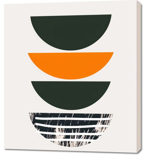 Obraz z serii boho zatytułowany Gra Tekstur to połączenie czystych, geometrycznych form z wyrazistą grą tekstur. Trzy półkoliste kształty w odcieniach głębokiej zieleni i żywej pomarańczy są ułożone w precyzyjny stos, tworząc zaskakującą głębię i zmysłową symetrię. Najniższa forma przerywa ten porządek, wprowadzając do dzieła dynamiczne, surowe detale, przypominające efekt artystycznego, spontanicznego malowania lub drapowania. Ten obraz jest idealnym wyborem dla wnętrz, które doceniają silne, graficzne elementy oraz surowy, industrialny klimat, pasując zarówno do minimalistycznych, jak i bardziej eklektycznych przestrzeni.