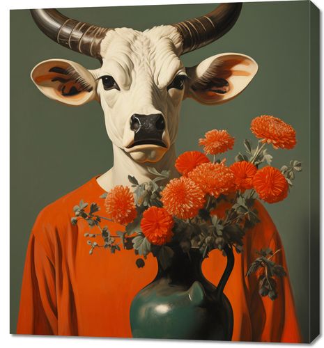 Obraz z serii wnętrza zatytułowany Harmonia Kontrastów. Byk o majestatycznym wyglądzie z intensywnym spojrzeniem, podkreślany przez imponujące rogi i białą sierść, staje w kontraście z delikatnością kwiatów pomarańczowych, które zdobią jego otoczenie. Pomarańczowa tunika, którą nosi, łączy się z barwą kwiatów, tworząc jednolitą paletę barw. Te zaskakujące połączenie elementów dodaje obrazowi nuty fantazji i oryginalności. Idealnie wpisuje się w nowoczesne wnętrza oraz galerie sztuki, gdzie ekscentryczność i kreatywność są na pierwszym planie.