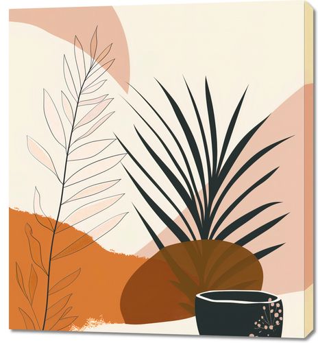 Obraz z serii minimalistyczne zatytułowany Harmonia Zen.Przedstawia eleganckie, abstrakcyjne formy roślin i geometryczne figury w ciepłych, pastelowych barwach zachodzącego słońca. Centralnym elementem jest stylowy czarny kubek z dekoracyjnym wzorem, który nadaje kompozycji głębi. Obraz ten będzie idealnym dodatkiem do spokojnych i stylowych wnętrz, jak sypialnie, pokoje relaksacyjne czy nowoczesne przestrzenie biurowe, wprowadzając atmosferę wyciszenia i estetycznego porządku.