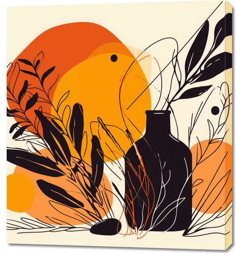 Obraz z serii minimalistyczne zatytułowany Jaskrawy Zachód. Na grafice widnieje silnie stylizowany motyw roślinny, gdzie czarne sylwetki roślin kontrastują z jaskrawo pomarańczowym i żółtym tłem, przypominającym zachodzące słońce. W tle pojawiają się delikatne, abstrakcyjne linie i kształty, dodające kompozycji głębi i tekstury.Ten plakat doskonale wpasuje się w wnętrza ożywione roślinnością, zarówno te domowe, jak i komercyjne przestrzenie typu kawiarnie lub sklepy z roślinami. Jego ciepłe barwy będą wprowadzać przytulną atmosferę i mogą stanowić żywy akcent w przestrzeniach utrzymanych w naturalnej kolorystyce.