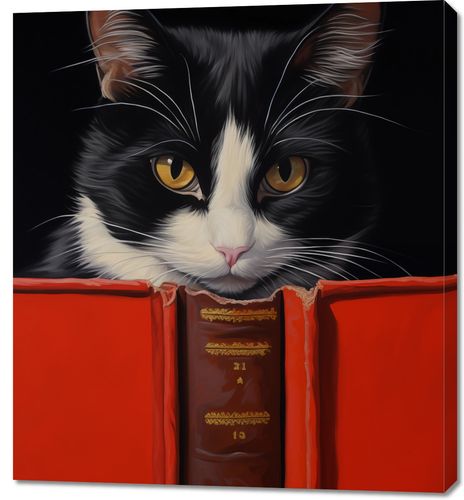 Obraz z serii wnętrza zatytułowany Koci Uczeń. Prezentuje on uroczego, czarno-białego kota z intensywnie żółtymi oczami, zaglądającego ciekawie do czerwonej, otwartej książki. Głęboki czarny tło podkreśla barwy i szczegółowe detale futra kota, a także złocenia na grzbiecie książki. Ten obraz łączy w sobie humor i ciepło, doskonale oddając osobowość i charakter kotów jako towarzyszy domowych. Idealny do umieszczenia w domowych bibliotekach, salonach czy pokojach dziecięcych, plakat ten dodaje wnętrzu przytulności i wprowadza zabawny, intelektualny element.