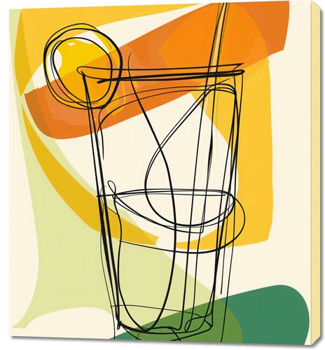 Obraz z serii boho zatytułowany Koktajl Artystyczny to kreatywne połączenie kolorów i linii, które razem tworzą abstrakcyjne przedstawienie szklanki z napojem. Dynamiczne, czarne kontury rysują się swobodnie, sugerując kształt i formę, podczas gdy tło w ciepłych odcieniach żółci i pomarańczy z nutą zieleni dodaje kompozycji letniego klimatu. Ten obraz przyciąga uwagę swoją swobodą formy i świeżością, nadając wnętrzu poczucie radosnej, niezobowiązującej atmosfery. Idealny dla tych, którzy chcą dodać swojemu otoczeniu odrobiny kulinarnego szaleństwa i artystycznego smaku.