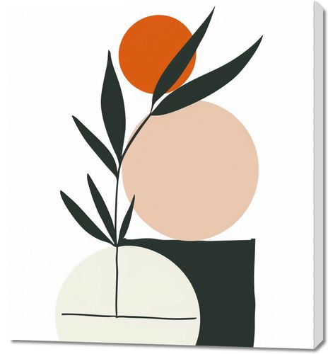 Obraz z serii boho zatytułowany Kompozycja Natury. Grafika łączy proste formy geometryczne z elementami przyrody, tworząc obraz, który jest jednocześnie nowoczesny i organiczny. Zestawienie gładkich, zaokrąglonych kształtów z ostrymi, ciemnymi liśćmi wprowadza wizualne napięcie, a pomarańczowa kula na wierzchołku gałązki przypomina zachodzące słońce lub soczysty owoc. Palecie barw dominują stonowane odcienie, które razem tworzą kojącą i zrelaksowaną atmosferę.Dzieło to doskonale sprawdzi się w przestrzeniach, które aspirują do stworzenia spokojnego i zbalansowanego wnętrza, takich jak jadalnie, poczekalnie lub pokoje relaksacyjne. Może także pełnić funkcję spajającą w pomieszczeniach z elementami zielonymi, takimi jak domowe ogrody zimowe czy salony w stylu eko.