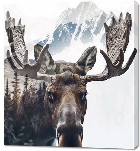 Obraz z serii natura zatytułowany Łoś Duch Lasu to majestatyczne przedstawienie łosia, którego potężne poroże przeobraża się w górski krajobraz. Na pierwszym planie widzimy głęboki, przenikliwy wzrok łosia, skupionego na widzu, z pięknymi, szczegółowo odwzorowanymi detalami sierści. Jego rozłożyste poroże płynnie przeistacza się w ośnieżone szczyty, co symbolizuje jego władzę i jedność z dziką przyrodą. Jasne, lekko zamglone tło sugeruje poranne światło, dodając plakatowi poczucia tajemnicy i dzikiego piękna. Ten obraz doskonale sprawdzi się w przestrzeniach inspirowanych naturą, takich jak chaty górskie, domy myśliwskie, lub jako wyraz głębokiego szacunku dla dzikiej przyrody w salonach i przestrzeniach wspólnych miłośników natury.