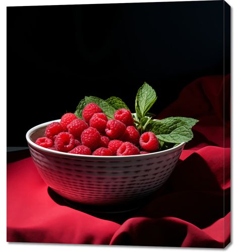 Obraz z serii wnętrza zatytułowany Malinowa Misa. Na tej wyrazistej kompozycji widnieje biała misa pełna świeżych, soczystych malin ułożonych na intensywnie czerwonej tkaninie, co tworzy zmysłowy kontrast kolorystyczny. Delikatne światło akcentujące fakturę i blask malin oraz dodatek zielonych liści mięty dodają świeżości i naturalnego piękna do sceny. Ten obraz z pewnością przyciągnie wzrok w każdej przestrzeni, od nowoczesnych kuchni po eleganckie jadalnie, a także stanowić będzie wyjątkowy element dekoracyjny w restauracjach i kawiarniach. Symbolizuje on radość z degustacji i estetyczną przyjemność, jaką dają proste, ale wyrafinowane smaki.