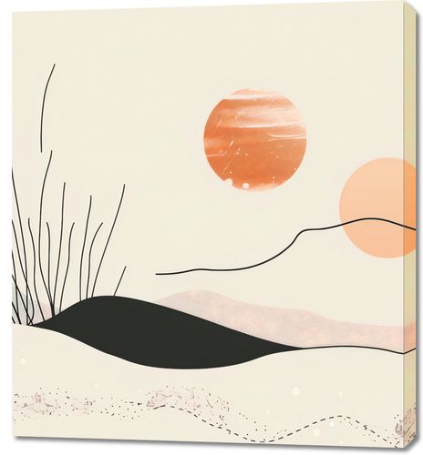 Obraz z serii boho zatytułowany Miękkie Wzgórze. Przedstawia on poetycką interpretację zachodzącego słońca, gdzie delikatne linie roślin wyłaniają się z miękkich, falujących wzgórz. Paleta kolorów to ciepłe odcienie beżu, różu oraz akcenty silniejszego pomarańczu i głębokiej czerni, które razem tworzą kojącą i spokojną atmosferę. Abstrakcyjne słońca o różnych odcieniach i wielkościach dodają kompozycji głębi i perspektywy. Ten obraz doskonale sprawdzi się jako akcent dekoracyjny w przestrzeniach, które mają być miejscem relaksu i odprężenia. Jego spokojna kolorystyka i delikatne linie będą komplementować wnętrza takie jak sypialnie, pokoje medytacyjne, gabinety relaksacyjne lub każde miejsce, które chce celebrować spokój i cichą elegancję.