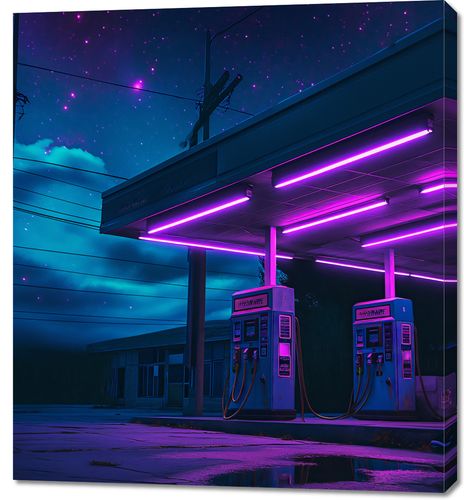 Obraz z serii pop art zatytułowany Moc Neonowej Nocy, ukazuje stację benzynową oświetloną fluorescencyjnymi neonami w hipnotyzujących odcieniach fioletu i różu. Tło stanowi nocne niebo pełne gwiazd, które nadają scenie kosmiczny, niemal oniryczny wymiar. Lśniące po deszczu kałuże odbijają neonowe światła, dodając głębi i tekstury do kompozycji. Ten obraz łączy elementy miejskiego pejzażu z aurą tajemniczości i futurystycznego piękna, idealnie pasując do nowoczesnych, miejskich przestrzeni, takich jak młodzieżowe sypialnie, studia projektowe, a nawet jako tło dla nowoczesnych barów i restauracji.