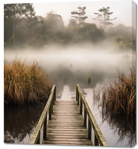 Obraz z serii pejzaże zatytułowany Most do Tajemnicy. Na tym mistycznym obrazie drewniana kładka prowadzi nas ku tajemniczej mgle, która delikatnie spowiła powierzchnię spokojnego stawu. Złote trzciny i zarysy drzew rzucają się w oczy na tle zamglonego poranka, tworząc uczucie ciepła i spokoju. Ten obraz oddaje piękno niewidzialnego świata, który czai się tuż za zasłoną mgły, zachęcając widza do refleksji i odkrywania nieznanego. Idealnie nadaje się do wnętrz, gdzie dominuje natura i spokój, takich jak salony spa, pokoje relaksacyjne, czy prywatne biblioteki. To wyjątkowy element dekoracyjny, który może przynieść element kontemplacji i odprężenia do każdego domu lub przestrzeni publicznej.