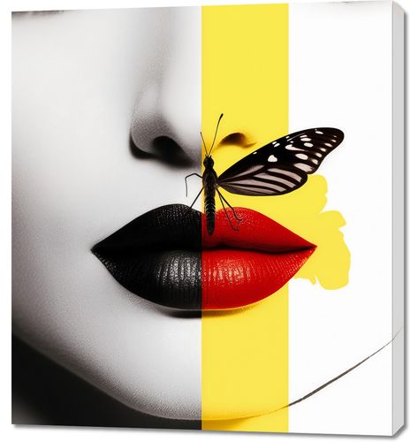 Obraz z serii abstrakcja zatytułowany Motyla Piękność. Ten obraz przedstawia twarz kobiety podzieloną na dwa kontrastujące segmenty: jeden w czerni i bieli, drugi w żywych kolorach z motylem na ustach. Ilustracja eksploruje temat dualizmu natury ludzkiej, piękna i jego zmienności. Obraz ten jest idealnym wyborem dla przestrzeni o współczesnym designie, takich jak salony piękności, studia artystyczne, a także jako wyrazisty element dekoracyjny w nowoczesnych domach.
