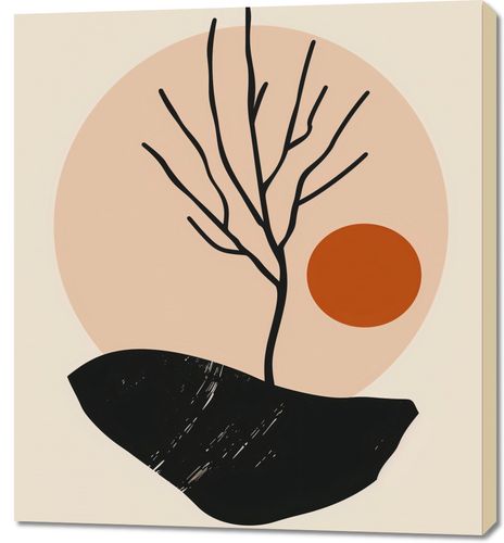 Obraz z serii minimalistyczne zatytułowany Nagie Drzewo przedstawia minimalistyczny krajobraz złożony z delikatnych, abstrakcyjnych form. Centralnym elementem jest drzewo o nagich, czarnych gałęziach, które wyłania się z zarysu odbijającego się, ciemnego wzgórza na pierwszym planie. Tło w pastelowych odcieniach beżu otacza drzewo, a na niebie widać okrągłe, ciepłe słońce w kolorze rustykalnego pomarańczu. Kompozycja łączy geometryczne kształty i naturalne motywy, tworząc spokojną atmosferę, idealną do wnętrz dążących do harmonii i równowagi. Ten obraz może odnaleźć swoje miejsce w nowoczesnych, minimalistycznych przestrzeniach, gdzie stonowana kolorystyka i proste linie podkreślą estetykę pomieszczenia.