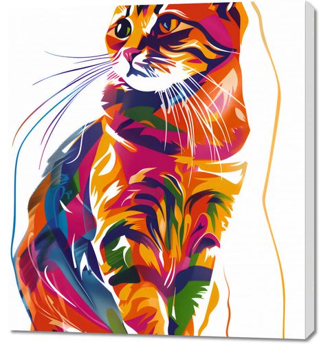 Obraz z serii abstrakcja zatytułowany Nasycony Kot prezentuje kota w stylu pop art, którego futro jest kolażem żywych i nasyconych kolorów, tworząc wizualnie hipnotyzujący efekt. Wzrok kota, z głębokimi i bystrymi oczami, wydaje się śledzić coś poza ramą obrazu, dodając tajemniczości i życia tej grafice. Ekspresyjne linie i kształty, które definiują postać, są odważne i dynamiczne, co podkreśla niezależny charakter zwierzęcia. Ta energetyczna i barwna ilustracja przyciąga wzrok i jest doskonałym dodatkiem do nowoczesnych przestrzeni, które chcą dodać odrobiny kreatywności i koloru, idealna do salonów, studiów artystycznych lub pokoi młodzieżowych.