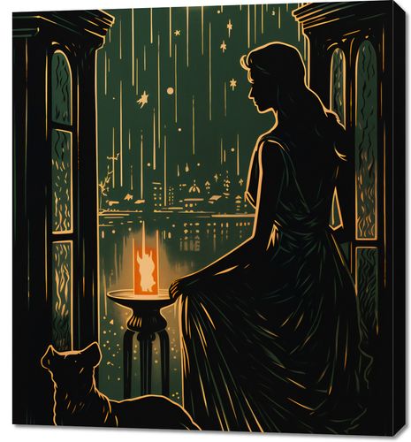 Obraz z serii pejzaże zatytułowany Nocne Szeptanie. Zadziwiająca sylwetka kobiety stojącej na balkonie, skąpana w świetle księżyca, jest podkreślana przez delikatne kontury jej sukni. Obok niej, wierny towarzysz w postaci kota, czuwa nad otoczeniem. Spokojna atmosfera miejskiej nocy na tle zorzy oraz migoczące gwiazdy nadają kompozycji niezwykłego uroku i głębokiej kontemplacji. Świetnie sprawdzi się w cichych kącikach czytelniczych, hotelowych lobby oraz w miejscach dedykowanych relaksowi i medytacji.