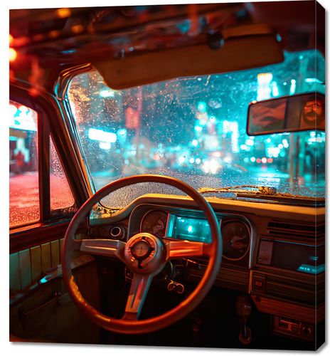 Obraz z serii pop art zatytułowany Nocny Kierowca, przedstawia widok z wnętrza klasycznego samochodu, patrząc przez deszczową, skraplaną szybę na rozświetlone neony miejskiego pejzażu nocą. Ciepłe, czerwone oświetlenie wnętrza samochodu kontrastuje z hipnotyzującym błękitem i elektrycznymi odcieniami świateł zewnętrznych, tworząc intymną, a jednocześnie dynamiczną atmosferę. Kropelki deszczu na szybie dodają tekstury i głębi, sprawiając, że scena jest zarówno realistyczna, jak i liryczna. To dzieło sztuki mogłoby znaleźć swoje miejsce w przestrzeniach nowoczesnych, miejskich loftów lub jako akcent w barze o tematyce retro, wprowadzając element tajemniczości i miejskiego romansu.