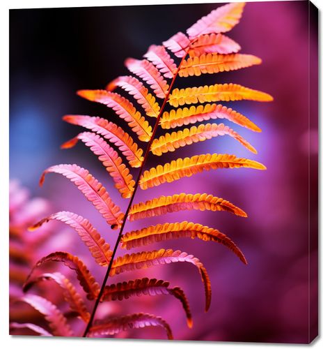 Obraz z serii natura zatytułowany Ogień Jesieni przedstawia pojedynczy liść paproci, który przechodzi przez spektrum ciepłych, jesiennych barw od żółci przez intensywną pomarańcz do głębokiego różu. Kontrastujące, żywe tło w odcieniach purpury podkreśla bogactwo i dynamikę liścia. Delikatne gradacje kolorów oraz wyraźna struktura paproci sprawiają, że obraz wydaje się niemal trójwymiarowy. Ta fotografia to idealny element dekoracyjny, który wprowadzi życie i ciepło do każdego wnętrza, nadając mu artystycznego charakteru. Doskonale sprawdzi się jako wyrazisty akcent w nowoczesnym salonie, sypialni lub biurze, szczególnie dla osób ceniących sobie naturę i jej niezwykłą paletę barw.