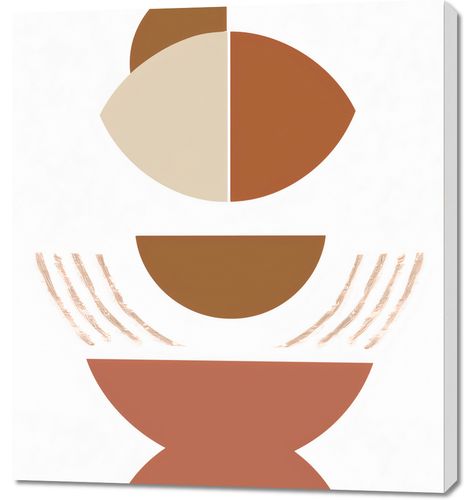 Obraz z serii boho zatytułowany Pastelowa Hipnoza. Łączy prostotę kształtów geometrycznych z subtelnością pastelowych barw, tworząc obraz o niemal hipnotycznym uporządkowaniu. W centrum kompozycji znajduje się dualistyczny kształt, który balansuje między symetrią a asymetrią, otoczony przez półkola i linie, przywołujące na myśl delikatne promienie słońca. Paleta kolorystyczna ogranicza się do ciepłych odcieni beżu, brązu i rdzawego różu, co dodaje dziełu wyrafinowanej subtelności. Doskonale odnajdzie się jako centralny punkt w jasnych, przestronnych wnętrzach, gdzie może stać się tłem dla głębokich refleksji, lub jako element dekoracyjny w minimalistycznie urządzonych pomieszczeniach, dodając im ciepła i elegancji.