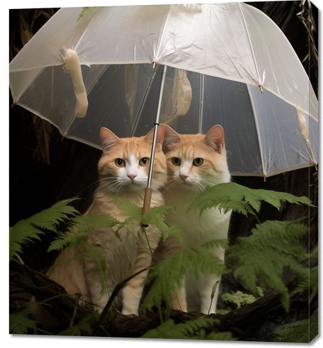 Obraz z serii wnętrza zatytułowany Podwójna Ochrona przedstawia dwie urocze, rude koty szukające schronienia pod przezroczystym parasolem, który zdaje się być koroną zielonej paproci. Ich symetryczne odbicie w połyskliwej strukturze parasola dodaje głębi i charakteru kompozycji. Ciepłe odcienie futra kotów kontrastują z ciemnym, zielonym tłem, co sprawia, że stają się centralnym punktem obrazu. Ich spojrzenia są skierowane prosto w obiektyw, co nadaje fotografii osobisty i intymny charakter. To zdjęcie idealnie uchwyciło moment spokoju i ochrony w naturalnym otoczeniu, a zarazem subtelnie podkreśla więź między dwoma zwierzętami. Idealne do wnętrz o domowym, ciepłym charakterze, zarówno dla miłośników kotów, jak i miłośników przyrody.
