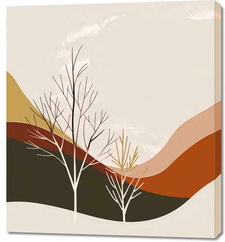 Obraz z serii minimalistyczne zatytułowany Pustynia Widzi. Obraz ukazuje dwie subtelne, ogołocone z liści drzewa, które wyłaniają się z miękkich, falujących form pustynnych wydm. Barwy są stonowane, z dominującymi odcieniami brązu, beżu i terakoty, co oddaje ciepłą i suchą atmosferę pustyni. Tło zawiera tekstury, które mogą przypominać piasek lub delikatną gęstwinę. Ten obraz doskonale sprawdzi się jako dodatek do wnętrz w stylu natur, dodając im ziemiściej palety i przywołując poczucie spokoju oraz prostoty. Będzie się dobrze komponować w przestrzeniach takich jak salon, pokój relaksu, a nawet biuro, wprowadzając elementy spokojnego krajobrazu, które mogą inspirować i uspokajać.