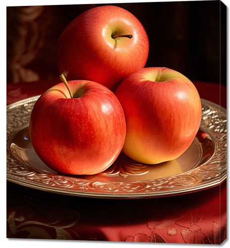 Obraz z serii natura zatytułowany Rubinowe Ekscesy. Trzy soczyste jabłka o lśniącej rubinowej skórce, delikatnie ułożone na antycznym srebrnym talerzu o bogato zdobionych brzegach. Każde jabłko jest uchwycone w pełni swojego naturalnego piękna, z delikatnymi refleksami światła podkreślającymi ich świeżość i kuszący wygląd. Tło z głębokim czerwonym brokatem, dodaje głębi i luksusu kompozycji. Obraz idealnie komponuje się w przestrzeniach kulinarnych, takich jak restauracje wysokiej klasy czy domowe kuchnie, gdzie podkreśla znaczenie estetyki w prezentacji potraw.