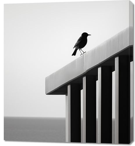 Obraz z serii pejzaże zatytułowany Samotna Odchłań. Ten skrajnie minimalistyczny obraz przedstawia pojedynczego ptaka spoczywającego na czystej, białej krawędzi konstrukcji, z subtelnym tłem nieskończonego morza. Zdjęcie w skali szarości, gdzie tylko kontury ptaka wyróżniają się na jednolitym tle, wywołuje poczucie spokoju i introspekcji. Idealny dla nowoczesnych przestrzeni biurowych i domowych, które pragną oddać hołd prostocie i skupieniu, a także jako przemyślany akcent w galeriach sztuki czy minimalistycznych salonach.