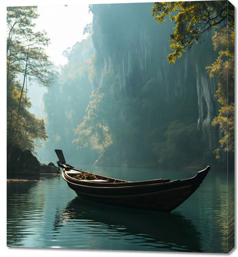Obraz z serii pejzaże zatytułowany Samotność na Tafli przedstawia idylliczny krajobraz, w którym centralnym punktem jest drewniana łódka unosząca się na spokojnych wodach jeziora. Otoczona przez majestatyczne, zielone drzewa i klify, które otulają wodę jak opiekuńcze ramiona, scena ta jest utrzymana w ciepłych, naturalnych barwach. Promienie słoneczne przebijają się przez liście, tworząc efekt tajemniczego światła i cieni na wodnej tafli. Całość kompozycji wywołuje uczucie spokoju i kontemplacji, idealnie oddając atmosferę zacisznego zakątka, oderwanego od zgiełku codzienności. Obraz ten będzie pasował do wnętrz, które pragną podkreślić łączność z naturą i stworzyć oazę spokoju, takich jak gabinety relaksacyjne, pokoje medytacyjne czy nawet jako spokojny akcent w nowoczesnych biurach.