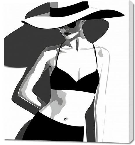 Obraz z serii abstrakcja zatytułowany Strój. Prezentuje stylizowany czarno-biały wizerunek kobiety w dwuczęściowym stroju kąpielowym. Postać odziana jest w szerokobrzmiony kapelusz, który rzuca cień na jej twarz, podkreślając elegancki i tajemniczy charakter kompozycji. Kobieta stoi w pozycji trzy czwarte, z jedną ręką opuszczoną wzdłuż ciała, a drugą lekko zgiętą w łokciu, co dodaje dynamizmu ilustracji. Obraz jest utrzymany w minimalistycznym stylu z wykorzystaniem płaskich plam kolorów i wyraźnych linii, co nadaje mu nowoczesny i modny wygląd. Ten rodzaj grafiki idealnie wpasuje się w nowoczesne wnętrza, szczególnie te o monochromatycznej kolorystyce, lub jako modny akcent w przestrzeniach o minimalistycznej estetyce.