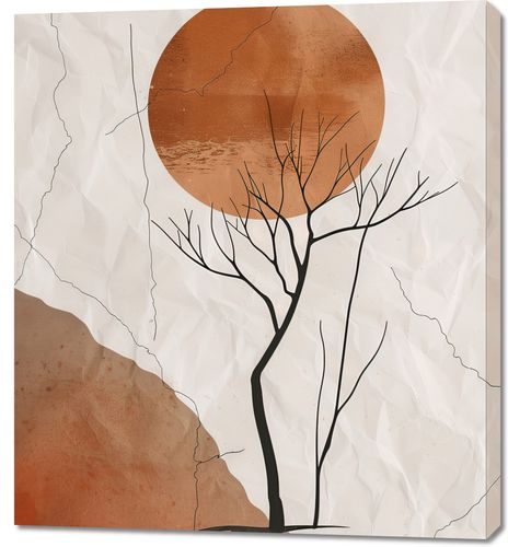 Obraz z serii minimalistyczne zatytułowany Surowość Pustyni to wizualne połączenie surowości pustyni z symboliczną prostotą. Na pierwszym planie widoczne są spękane, rudo-czerwone tereny, na których cienka, czarna sylwetka drzewa rzuca się w oczy swoim szkieletowym kształtem. Nad tym minimalistycznym krajobrazem unosi się duży, pełny krąg w tonacji rdzawej, sugerując gorące słońce lub wielki księżyc. Tło, z delikatnymi plamami i teksturą przypominającą pomarszczony papier, dodaje głębi i tekstury. Ten obraz to mieszanka prostoty i głębi, idealna dla przestrzeni ceniących spokój, równowagę i surowe piękno natury.