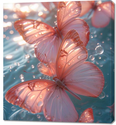Obraz z serii natura zatytułowany Świetliste Motyle. Na obrazie widzimy delikatne motyle o przezroczystych, różowych skrzydłach, unoszące się nad wodą i łagodnie odbijające światło słoneczne. Kropelki wody na ich skrzydłach dodają uczucia świeżości i czystości. Obraz emanuje spokojem i pięknem, idealnie nadając się do przestrzeni, które chcą wprowadzić element relaksu i spokoju, takich jak spa, pokoje medytacyjne, a także jako łagodny element dekoracyjny do domu.