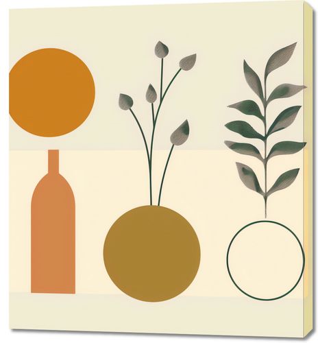 Obraz z serii boho zatytułowany Symfonia Równowagi. Obraz łączy organiczne kształty roślin z rygorystyczną formą geometrii. Prezentuje on wazony w spokojnych odcieniach brązu i złota, z których jeden jest ozdobiony gałązkami z delikatnymi pąkami, a drugi pokazuje symetryczny wzór liści. Proste linie i figury geometryczne, takie jak okrąg i prostokąt, tworzą tło dla roślinności, przypominając o ludzkiej próbie ujarzmienia natury. Całość osadzona na pastelowym tle wywołuje uczucie spokoju i harmonii. To dzieło będzie pasowało do przestrzeni, które cenią równowagę między naturą a stworzonym przez człowieka porządkiem, jak eleganckie gabinety, przestrzenie wellness lub strefy odpoczynku, które dążą do stworzenia oazy spokoju w zabieganym świecie.