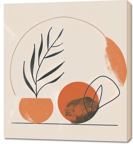Obraz z serii boho zatytułowany Tonacja Pasteli. Obraz przedstawia harmonijną kompozycję elementów natury i abstrakcyjnych kształtów. Widzimy doniczkę z delikatną rośliną o czarnych, smukłych liściach, które delikatnie kontrastują z ciepłym odcieniem pomarańczy naczynia. Towarzyszą jej geometryczne formy: dwa krągłe kształty w tonacji ziemi, które przeplatają się, tworząc iluzję przestrzeni i głębi. Rysunek uzupełnia subtelna linia horyzontu i rozproszone kropki, dodające plakatowi dynamiki. Idealnie sprawdzi się jako element dekoracyjny w pomieszczeniach, gdzie dominuje spokój i równowaga, takich jak jasne, przestronne salony, pokoje do medytacji lub ciche zakątki bibliotek.